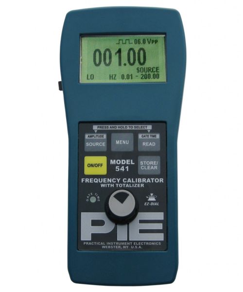- PIE 541 Frequency Calibrator with TotalizerThe Practical Instrument Electronics (PIE) Model 541 is the best tool for calibration, test, and diagnosing turbine meters, frequency counters, vibration systems, tachometers, flow meters, vortex shedders, integrators, and any other Frequency devices in the shop, plant and/or field. The Model 541 brings all the features you would expect from a frequency calibrator and times new romanaving new ones. The Model 541 comes with an LED indicator showing gate time for easy trigger level adjustment. Make adjustments with the EZ-Dial™ knob or test limits with the dual action EZ-Check™ switch. Save hours of troubleshooting time on problems when compared to other calibration methods. When calibrating a totalizer, the PIE 541 eliminates the need of a stop watch. This calibrator will automatically stop when the selected number of pulses has been sent to the totalizer. Select from 6 different frequency ranges or select totalize to source or measure pulses within a selectable time.