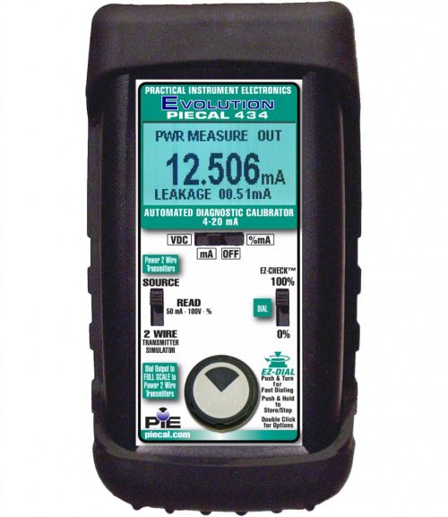Download Data Sheet | Product Manual Learn More$3,879.00 - PIE 434 Automated Diagnostic 4-20 mA CalibratorThe Practical Instrument Electronics (PIE) 434 automated diagnostic 4-20 mA calibrator allows you to check, calibrate and measure all of your current signal instruments in a 4-20 mA DC loop. It can be used at any access point in your loop. You can calibrate recorders, digital indicators, stroke valves or any instruments that get their input from a 4-20 mA loop. Quickly diagnose ground fault and current leakage with the PIE 434 automated diagnostic 4-20 mA calibrator's loop diagnostic technology. PIE 434 calibrators also feature automatic output stepping and ramping. Press and hold the dial to automatically step from 4-20 in two, three or five steps or choose a continuous ramp.