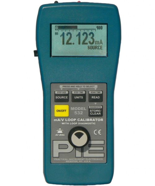 Download Data Sheet Learn More$6,300.00 - PIE 532 Loop Calibrator with Loop DiagnosticsThe Practical Instrument Electronics (PIE) Model 532 is the best tool for calibration, test, and diagnosing process loops. The Model 532 brings all the features you would expect from a loop calibrator and times new romanaving new ones. Make adjustments with the EZ-Dial™ knob or test limits with the Dual Action EZ-Check™ switch. Powerful ramping functions are only a button away on the Model 532. Save potentially hours of troubleshooting time on problem loops with the Model 532’s unique Loop Diagnostic Mode, only available at PIE! In Loop Diagnostic Mode, the loop current, voltage, impedance, AC voltage, and mode of operation are all displayed simultaneously eliminating the need of a DMM connection. Loop diagnostics is available in every mode of operation and truly is a diagnostic monitor, as parameters are continuously updated in real time. The smart diagnostic tool even indicates the most likely cause of loop failure! Loop Diagnostic features the ability to measure ground fault error caused by faulty wiring, flooded conduit and corrosion bridges.