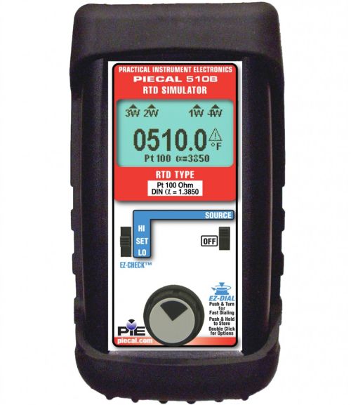 Download Data Sheet | Product Manual Learn More$999.00 - PIE 510B RTD SimulatorsThe PIECAL Model 510B simulates RTD resistances into all types of instruments such as transmitters, recorders, controllers, alarms, data acquisition, and computer systems. The PIECAL 510B is a superior replacement for decade boxes, so there is no need to lug a decade box around or be prone to error by reading RTD tables incorrectly. The PIECAL 510B has better accuracy and functions of many higher priced RTD calibrators.