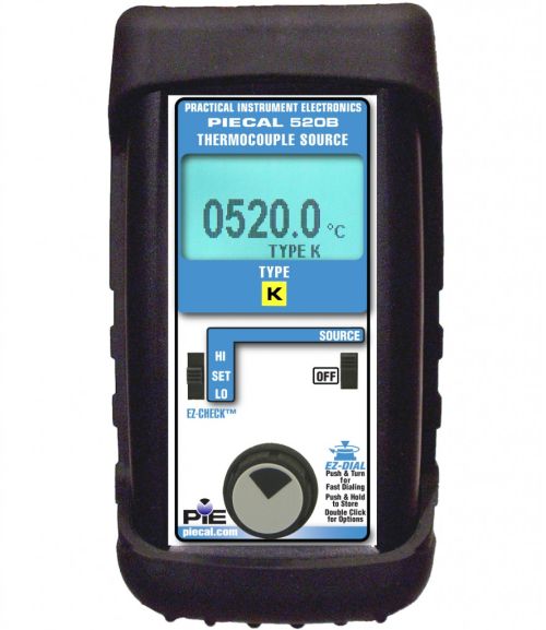 Download Data Sheet | Product Manual Learn More$669.00 - PIE 520B Thermocouple SimulatorsThe PIECAL 520B Thermocouple Simulator simulates a dedicated standard thermocouple curve over the entire industrial temperature range. The PIECAL 520B provides precise temperatures for inputs to all types of instruments such as transmitters, recorders, controllers, alarms, data acquisition, and computer systems. PIECAL 520B is cold-junction compensated for changes in ambient temperature. The PIECAL 520B offers the highest performance and functions in its class by exceeding the accuracy and functions of many higher priced thermocouple calibrators.