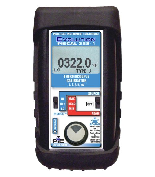 Download Data Sheet Learn More$1,729.00 - PIE 322-1 Thermocouple CalibratorThe PIECAL 322-1 gives you advantages of an updated design while maintaining the familiar, time proven ease of use of similar calibrators. Choose the PIECAL 322 and get a thermocouple calibrator with a backlit display, a rubber boot and rugged switches with the same high accuracy.
