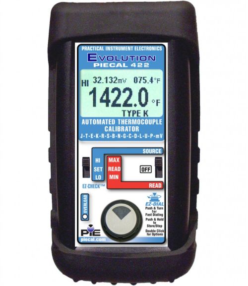 Download Data Sheet | Product Manual Learn More$799.00 - PIE 422 Automated Thermocouple Calibrator 14 TypesThe PIECAL 422 is functionally equivalent to similar calibrators with five digit displays, knobs and switches. The PIECAL 422 gives you advantages of an updated design while maintaining the familiar, time proven ease of use of similar calibrators. Choose the J, K, T, E, R, S, B, N, G, C, D, L (J DIN), U (T DIN) & P (Platinel); -13.000 to 80.000 mVand get a thermocouple calibrator with a backlit display, automatic stepping, simultaneous display of temperature and millivolt reading, a rubber boot and rugged switches with the same high accuracy.